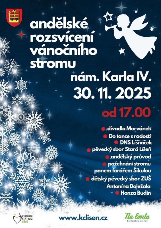 Přijďte si užít nezapomenutelný podvečer plný hudby, vůně svařeného vína a také trochu tajemna v obdobě světýlek, které přinesou andílci. Budeme se na Vás těšit v neděli 30. listopadu od 17 hodin na náměstí Karla IV.