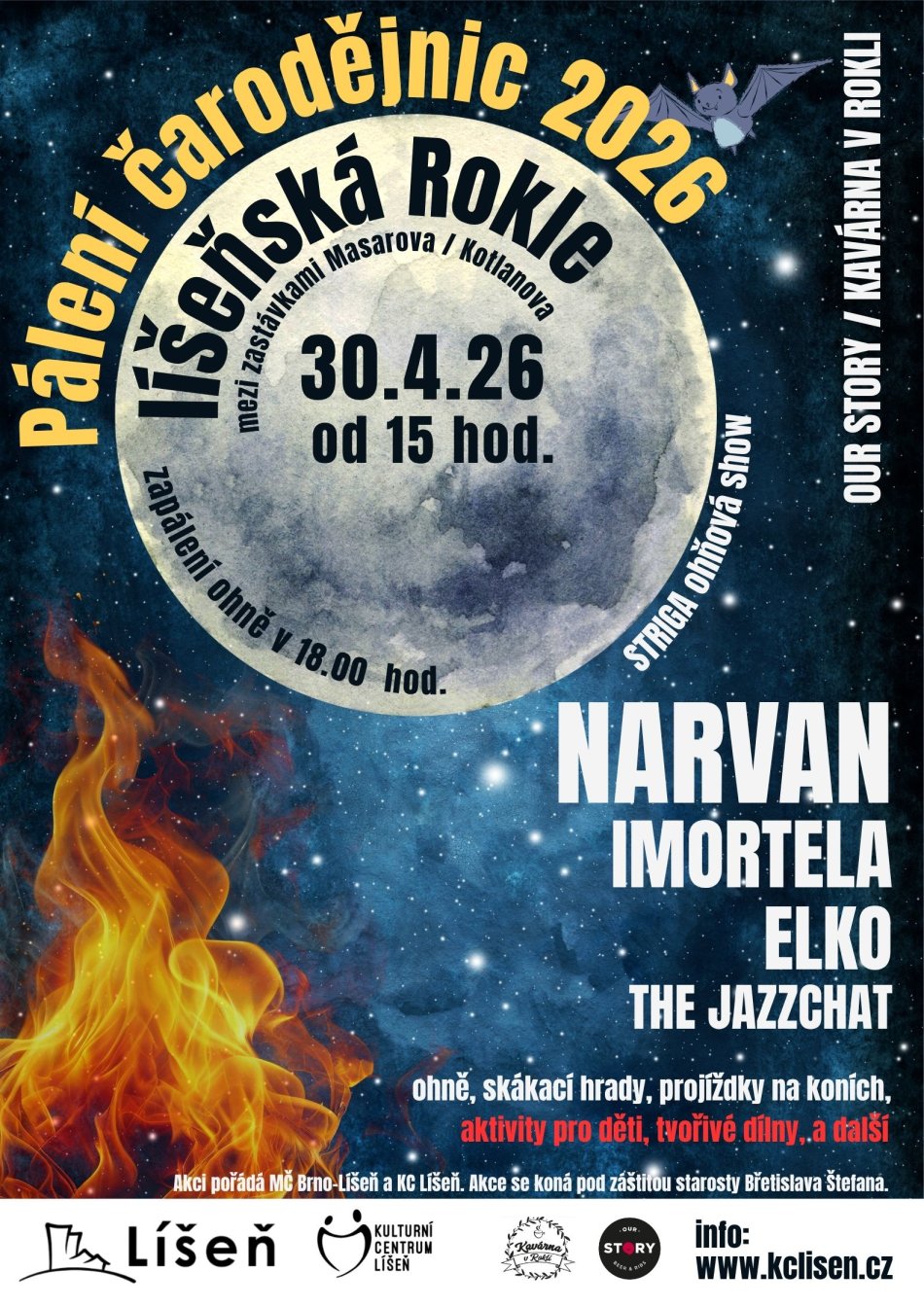 Další program bude patřit koncertům – od 18.30 zahraje melodic metalová kapela IMORTELA, ve 20.00 na ni naváže brněnská funková legenda NARVAN. O jedinečnou podívanou se ve 21.30 postará ohnivá skupina STRIGA zpod Radhoště a celý večer zakončí taneční party s DJ Helískem od 22.00!