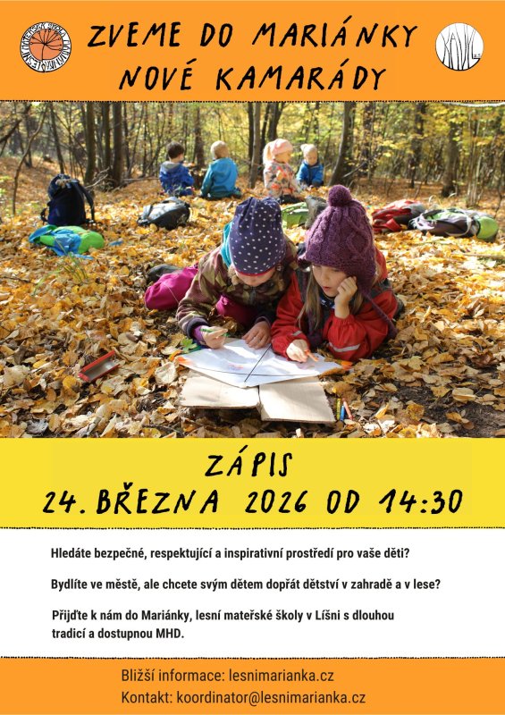 Hledáte pro své dítě školku s individuálním přístupem a dlouholetou zkušeností? Srdečně zveme k zápisu do Lesní mateřské školy Mariánky, která v Líšni působí již od roku 2012. Školkou prošly desítky dětí, první absolventi jsou gymnazisté a středoškoláci, mnozí další jsou spolužáky vašich dětí na líšeňských základních školách. Zápis pro školní rok 2026/27 proběhne 24. března 2026 od 14:30 do 16:30 hodin v zázemí školky na konci ulice Samoty.