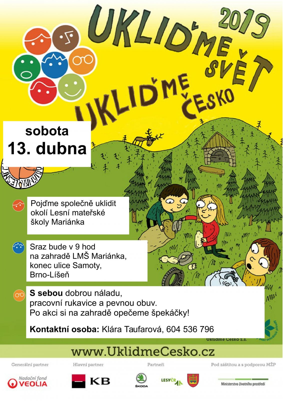 Pojďme společně s dětmi uklidit líšeňské lesy! Po záslužné práci se můžete občerstvit a děti vydovádět na zahradě Lesní mateřské školy Mariánka na Samotách.