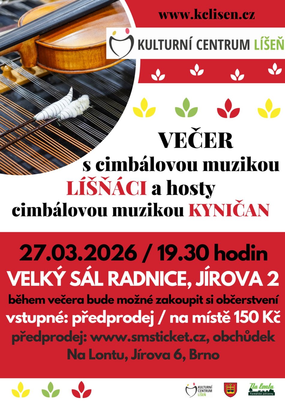 Přijďte si zatancovat, poslechnout i zazpívat oblíbené i méně známé lidové písně v podání Cimbálové muziky Líšňáci a jejich hostů CM Kyničan. Můžete se těšit na uvolněnou atmosféru, zpěv, občerstvení a taneční parket, na kterém rozhodně nebudete sami!