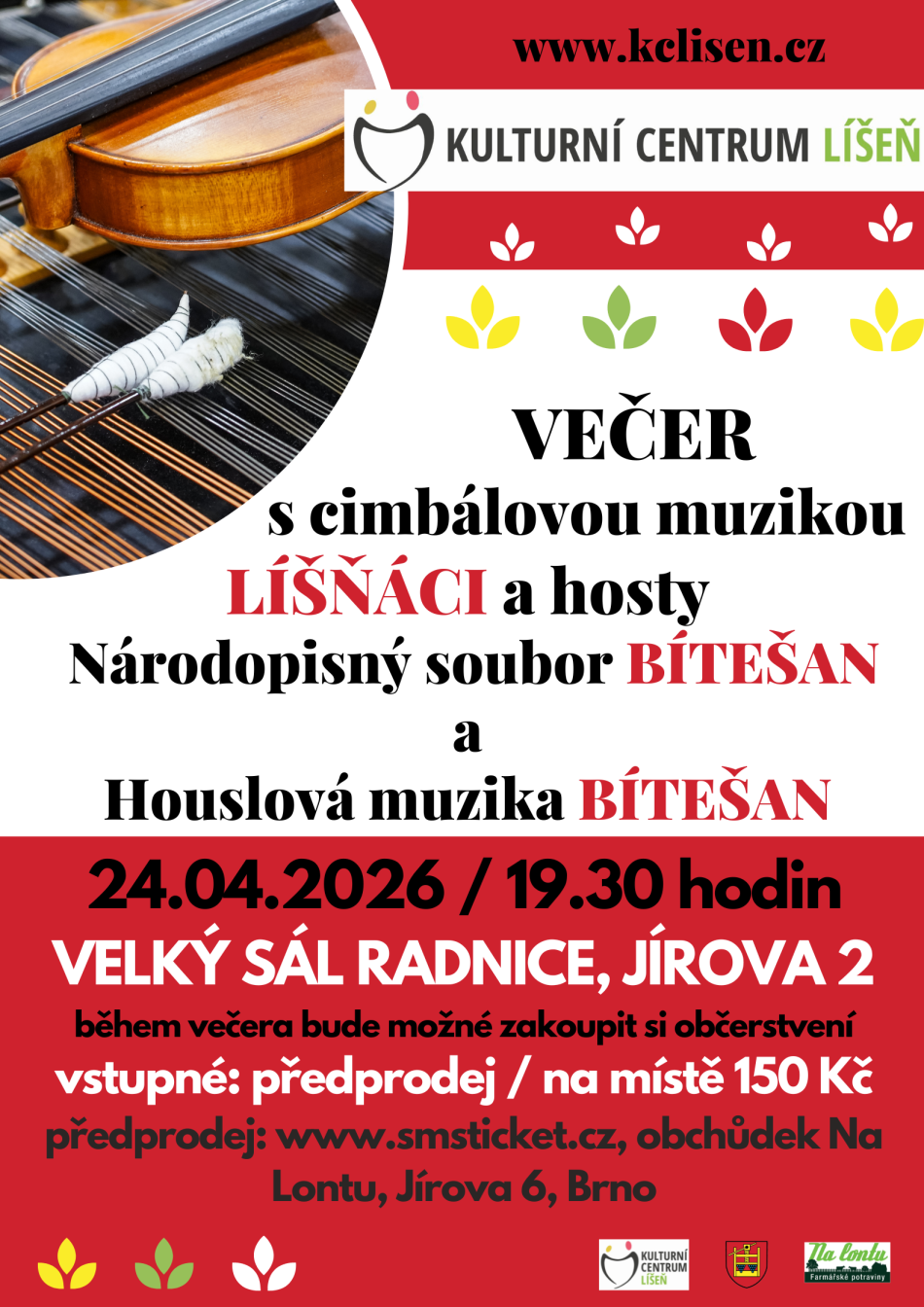 Přijďte si zatancovat, poslechnout i zazpívat oblíbené i méně známé lidové písně v podání Cimbálové muziky Líšňáci a jejich hostů Národopisného souboru a Cimbálové Muziky Bítešan.