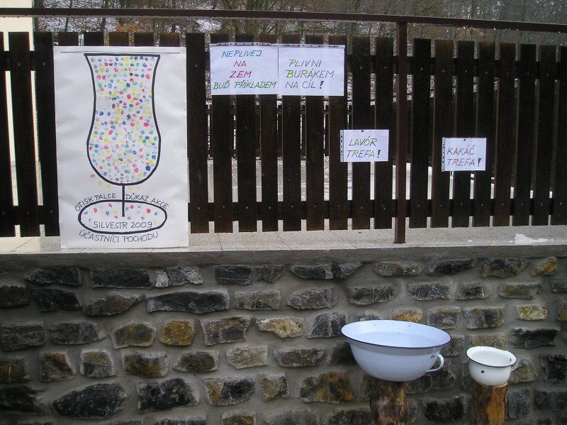 Poté co se odvážní spustili z prudkého kopce a ostatní obešli bývalou hájovnu, aby se všichni sešli u horkého čaje, na ně čekalo několik úkolů, které s železnou pravidelností rok co rok s malými obměnami vymýšlí F. Kalandra. Také tentokrát po otisku palce na plakát s obří číší následovala výchovná soutěž pro děti i dospělé. Jejím motivem byl boj proti plivání hlavně žvýkaček na sportovištích. Komu se podařilo doplivnout vyloupnutý burák do připravených nádob, byl odměněn. Drobné zpestření silvestrovského výšlapu navodilo veselou atmosféru pro zbytek cesty k cíli. Na konci cesty v restauraci Na radnici čekalo na účastníky občerstvení, sladkosti, drobné keramické dárky pro děti a diplomy do domácích archívů. Diplomy i startovní kartičky v silvestrovské grafické úpravě opět zajistil M. Hrazdíra.Velmi dobrou tradicí se stává činnost stálého účastníka pochodů P. Dostála. S fotoaparátem projde celou trasu a výsledkem je pestrá řada záběrů.
